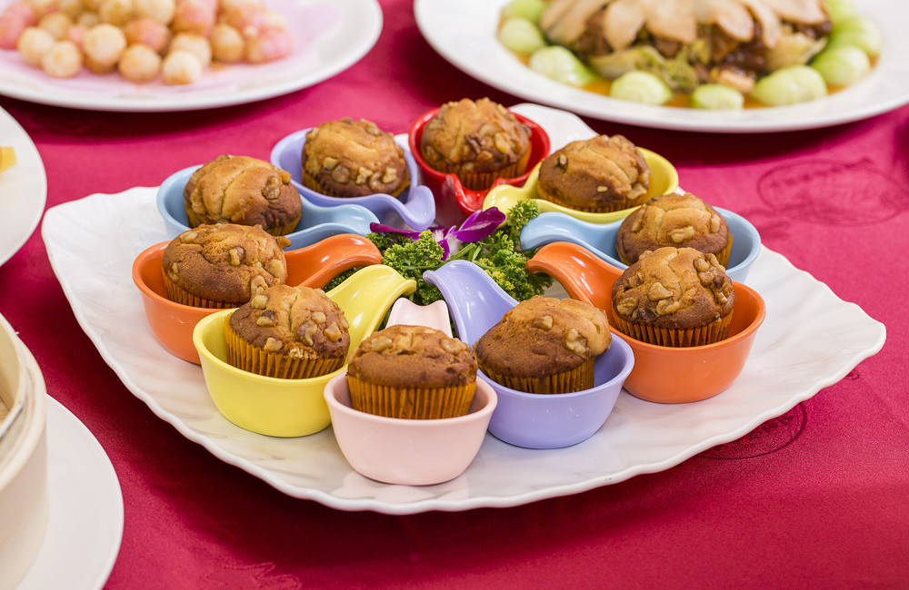 貼心的將健康美味的桂圓蛋糕分別放入色彩繽紛的器皿裡,最後再以PET無毒矩形盤盛裝,用來取代沉甸甸的陶瓷盤。